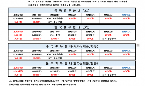 연휴 전후로 발송되는 소포 통관 및 배송도 영향을 받을 수 있습니다. 사전에 수취인에게 통지해 주시기 바랍니다.연휴 이후 물량 집중으로 인해 통관작업 및 택배사 배송이 지연 예상되며,